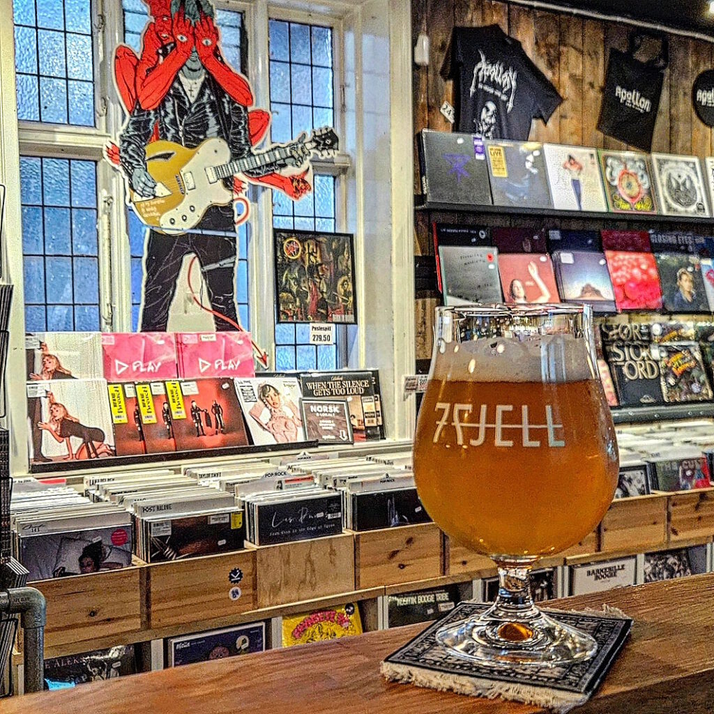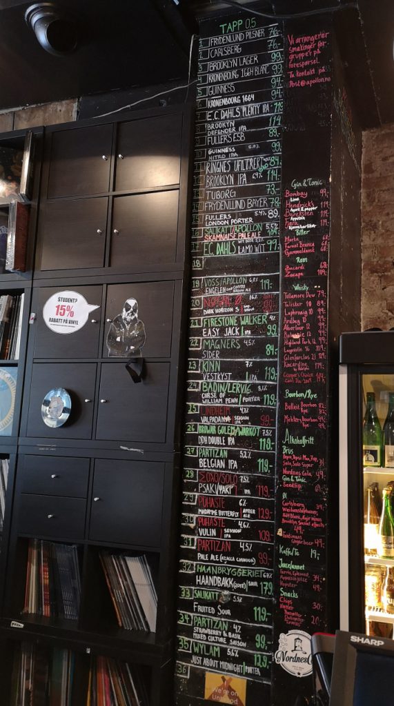 Vierzig Jahre ist das her, und ich fühle mich heute, am 3. Juni 2019, in diese Zeit versetzt, als ich die Apollon Platebar in Bergen betrete. Kisten, Kartons, Schubladen und Regale voller Vinyl. Merkwürdig gekleidete Typen, exzentrische Einzelgänger genauso wie partygeile Herdentiere, stehen herum und blättern auf der Suche nach Raritäten durch die Alben. Ich setze mich mitten hinein an die Theke und studiere die ellenlange Bierliste, die, guter Tradition folgend, mit Kreide auf einer großen schwarzen Tafel verzeichnet ist.