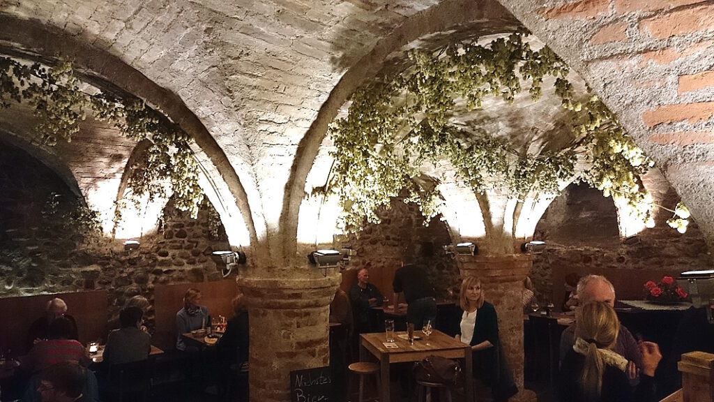 Über uns selbst und unser Erstaunen lachend suchen wir uns einen Platz am Rand des Kellers, von dem aus wir alles sehen können. Wunderschöne alte Gewölbe, dazwischen Tische für vielleicht fünfzig Personen, die meisten besetzt. Ein Klavier am Rand, und an der Längsseite, zweieinhalb Ziegelbögen lang, die Theke. Ein Flachbildschirm informiert über die acht Biere am Zapfhahn – jedes einzelne kann im Verkostungsglas als 150-ml-Portion bestellt werden.