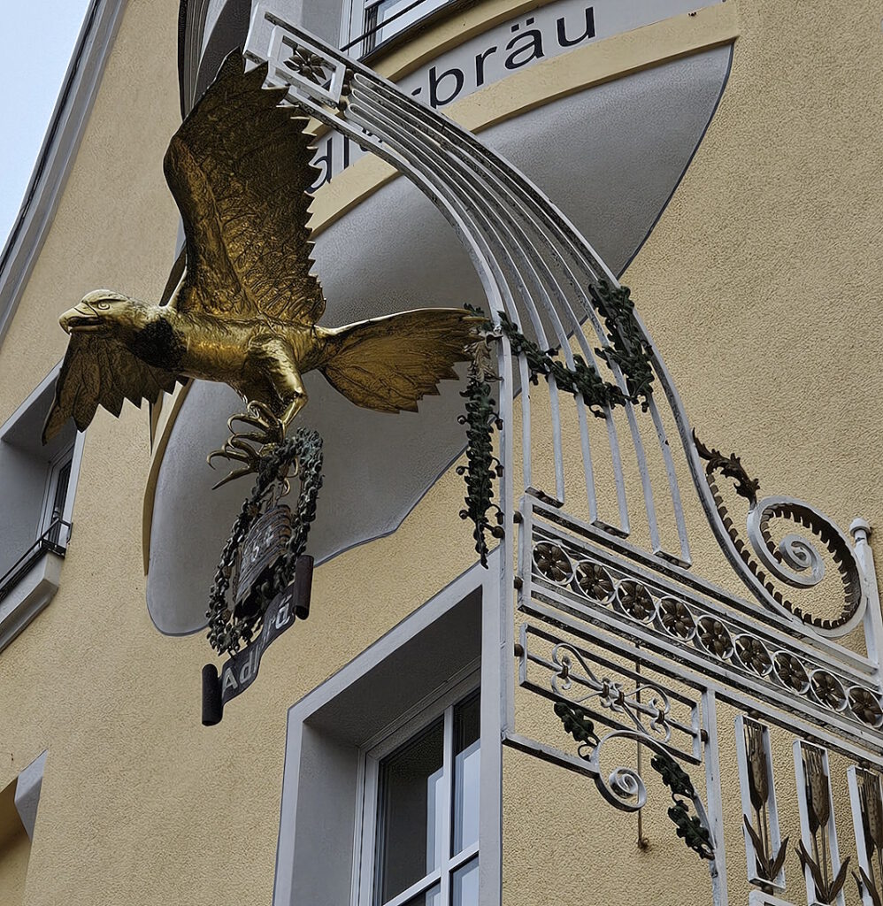 Am 27. November 2023 war es mir immerhin vergönnt, die Front des Gebäudes und das schöne Wirtshausschild anzuschauen und zu fotografieren – eine kleine Erinnerung an die stolzen Brauereizeiten.
