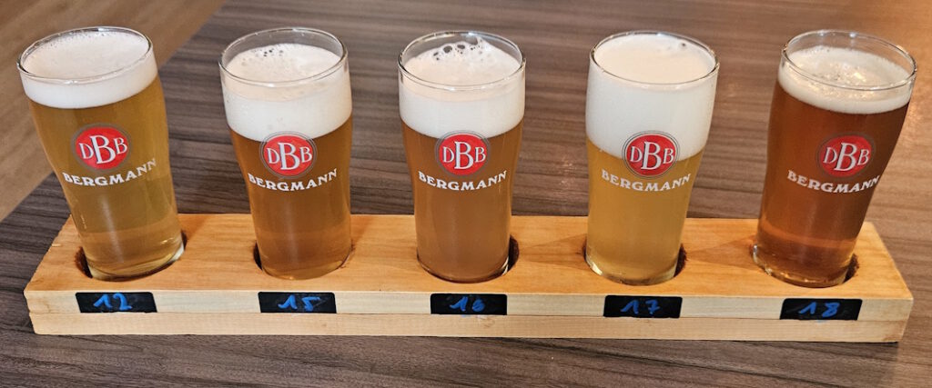Jetzt gibt es einen Biertester. Fünf kleine Gläser, hier im Pott Stößchen genannt. Alle mit Bergmann-Branding, aber mit spannendem Inhalt: