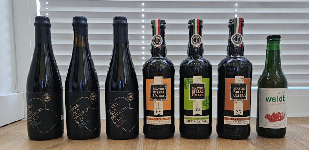 Was ich aber weiß, ist, dass mein lieber Freund Frank, als er das gehört hat, schnell noch eine größere Bestellung aufgab und einiges aus den Restbeständen gekauft hat. Uuuund … mit mir teilt! Eine große Tasche voller Bierflaschen hat er dabei, als er auf eine Tasse Kaffee vorbeikommt.