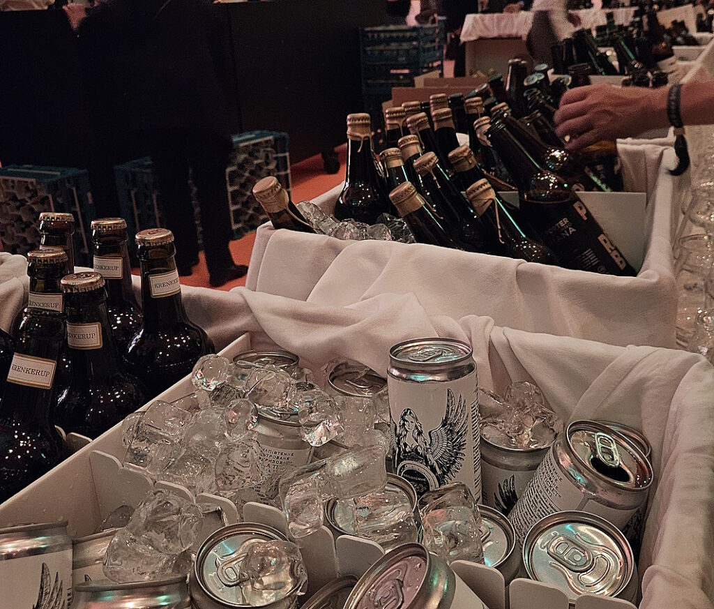 Der Chronist hingegen fokussiert sich lieber auf die unmittelbar anschließende Nacht der Sieger, zu der Vertreter der geehrten Brauereien und sowie ausgewählte Branchenrepräsentanten und Medienvertreter eingeladen sind. Neben einem vorzüglichen Büffet, das keine kulinarischen Wünsche offen lässt, und fröhlicher Livemusik auf der Bühne gibt es fast alle Siegerbiere auch zu verkosten. In endlos langen Reihen von Kühlkästen stehen die Dosen und Flaschen mitten im Festsaal, sorgfältig sortiert, und man kann entweder an den Kästen vorbeibummeln und mal hier und mal da hineingreifen, oder man nimmt sich das kleine Heftchen mit der ausgedruckten Liste aller verfügbaren Gewinnerbiere und macht sich ganz gezielt auf die Suche nach bestimmten Bierspezialitäten.