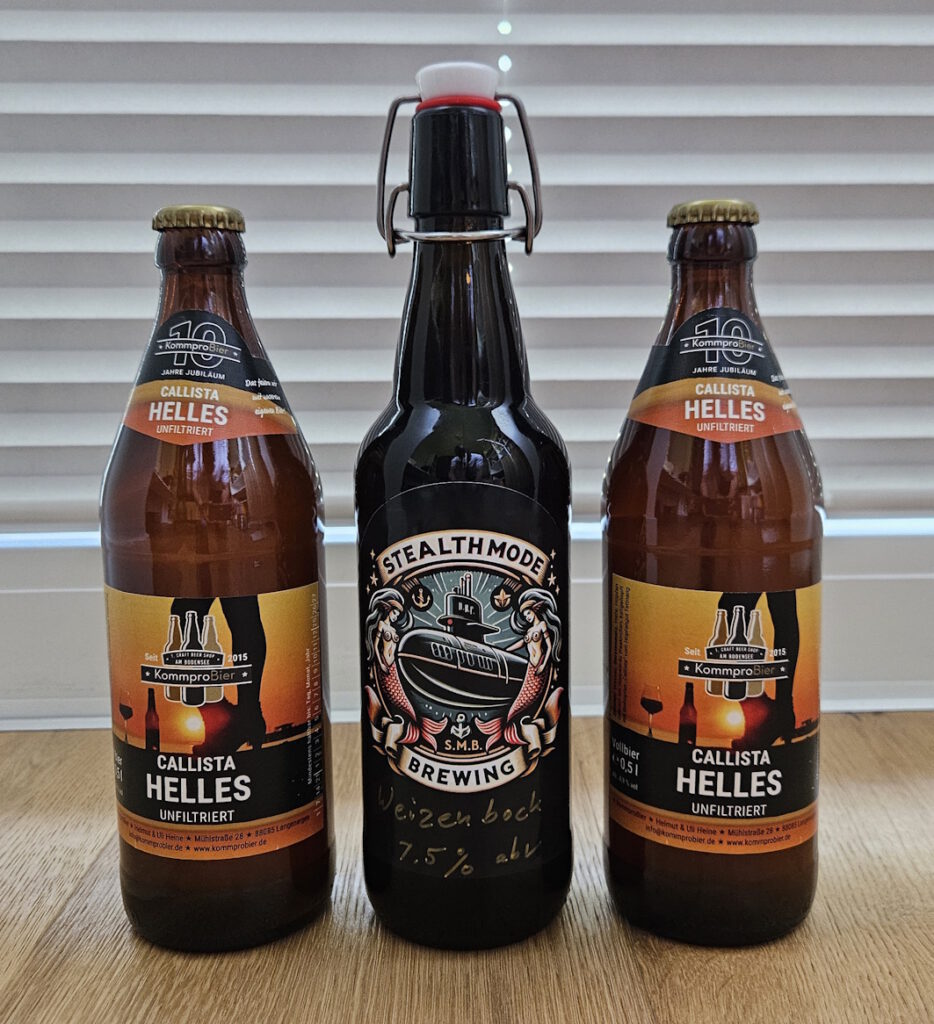 Um so schöner die Überraschung heute, als ein Probierpaket eintrifft – mit zwei Flaschen des KommproBier Callista Hellem. Gebraut bei Hoppebräu in Waakirchen, aber handgehopft von Uli und Helmut persönlich. Sooo schön! Und als Dreingabe sogar noch eine Flasche Selbstgebrautes aus Australien. Harald Walt, der mich schon einmal ein Bier seiner häuslichen Produktion hat verkosten lassen (und die Flasche dafür extra einmal um den Globus expediert hatte), hat mir erneut eine Flasche zukommen lassen. Mittlerweile unter dem Label Stealth Mode Brewing. Rund 20.000 Kilometer Anreise (plus nochmal 700 von Langenargen bis Wunstorf) hat die Flasche hinter sich.