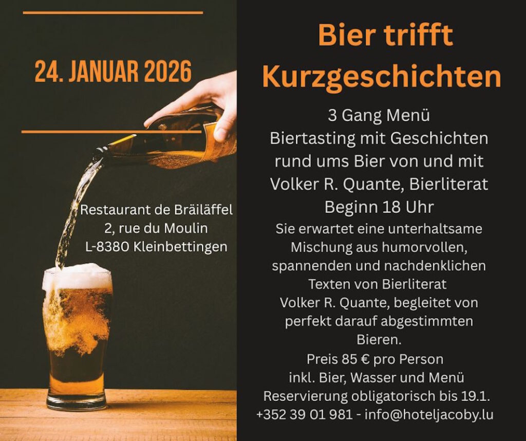 Euch erwartet eine unterhaltsame Mischung aus insgesamt sechs humorvollen, spannenden und nachdenklichen Texten, vorgetragen und performed durch den Bierliteraten Volker R. Quante. Zu jeder Story verkostet er mit Euch ein perfekt auf die Geschichte abgestimmtes Bier und erzählt von den Hintergründen zum Bier, zur Brauerei, die es herstellt, und zur Kulturgeschichte des Biers. Zwischendrin wird Euch die Küche des Restaurant de Bräiläffel mit einem vorzüglichen Drei-Gang-Menü verwöhnen, und gemeinsam werden wir für einen unvergesslichen Biergenussabend sorgen.
