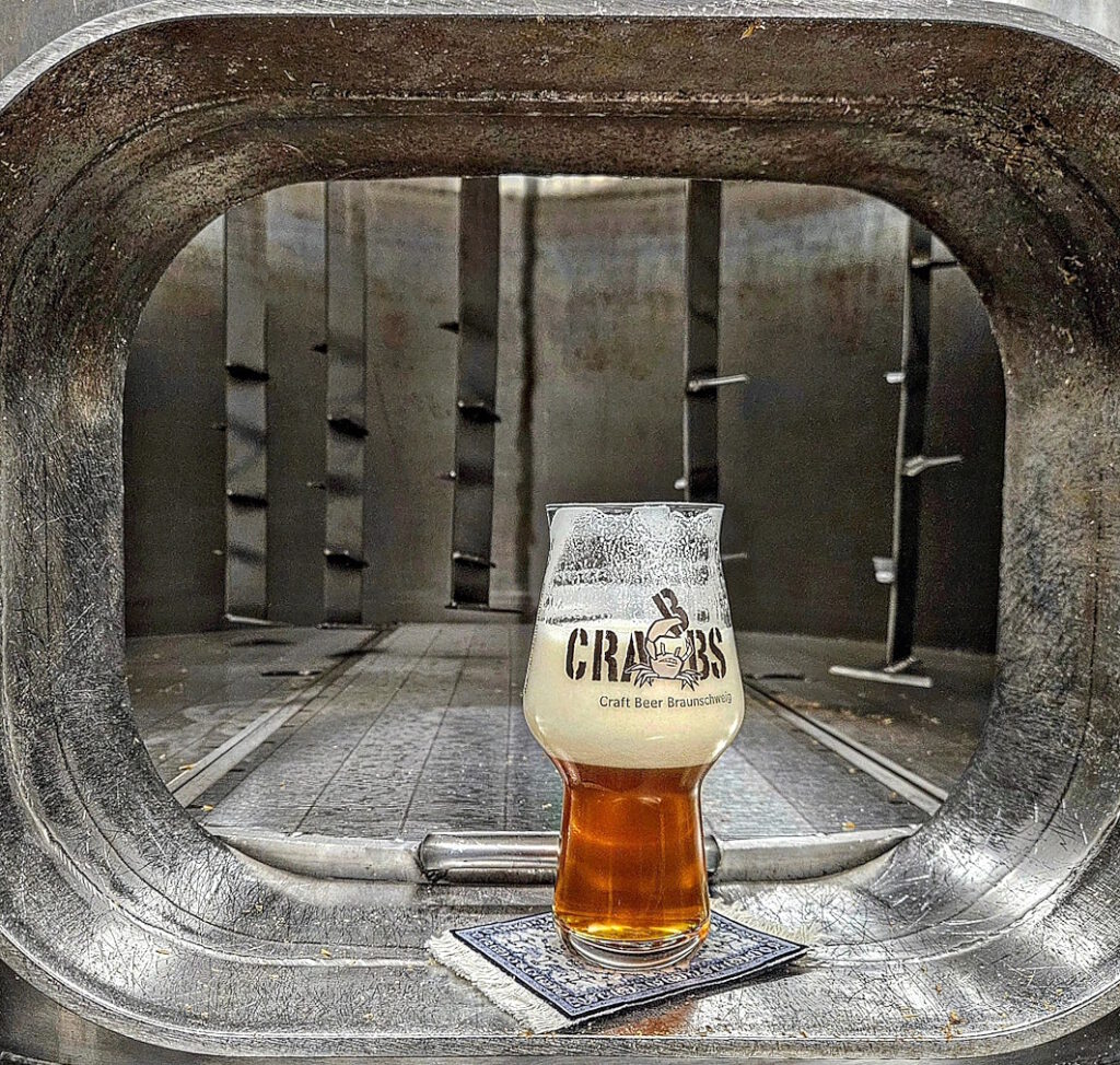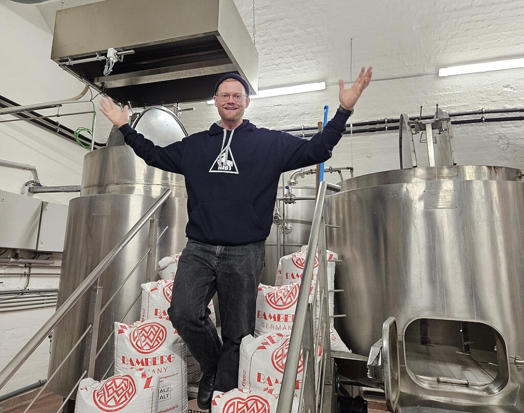 „Ihr habt das kleine Sudwerk oben gesehen, da machen wir nur ab und an mal experimentellere Sude, aber unsere eigentliche Brauerei steht hier im Keller. Zehn Hektoliter groß und ein absolutes Einzelstück. Hergestellt seinerzeit für die Brauerei Hennings in Schwerin, nach Plänen von Tim Hennings, aber von einer Firma, die noch nie vorher eine Brauerei gebaut hatte.“ Er deutet auf eine Metallplakette am Läuterbottich. „Die haben tolle Arbeit geleistet, aber nicht verstanden, was sie da zusammengeschweißt haben, denn an der Sudpfanne hängt die Plakette mit der Beschriftung Läuterbottich und umgekehrt …“
