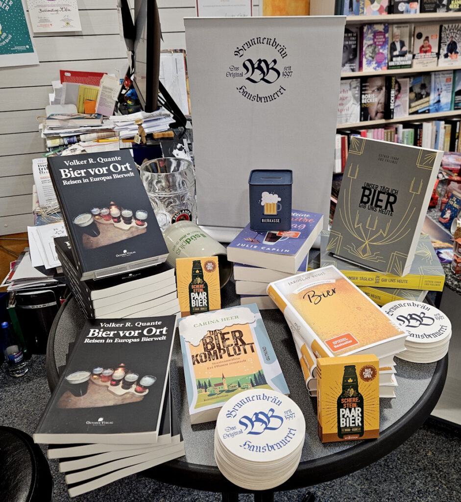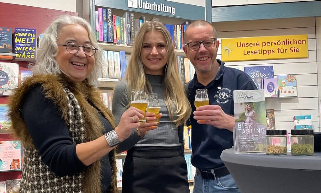 Das Tiefgeschoss von Sabina Kratts urgemütlicher Buchhandlung Klein mitten in Rottweils historischem Zentrum war bis auf den letzten Platz gefüllt, als die ehemalige baden-württembergische Bierprinzessin und Biersommelière Nina Witzemann, bekannt als Nina Bierista, und ich sechs interessante Biere aus der Region vorstellen und dazu witzige, skurrile und lustige Anekdoten erzählen, vorlesen und vorspielen durften.