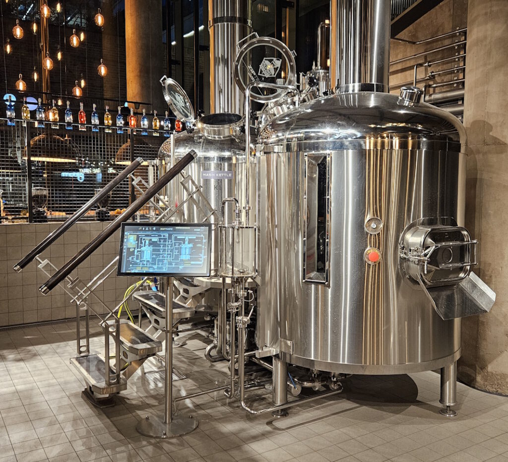 Fortsetzung ein paar Stunden später: Uih, hier ist aber was los! Eine lange Schlange vor dem Eingang. Brav stellen wir uns an, und als wir nach ein paar Minuten merken, dass die Schlange nur für die namentlich zu erfassenden Teilnehmer einer geschlossenen Veranstaltung gilt, haben wir sie ruckzuck überholt und uns einen schönen Tisch am Fenster mit freiem Blick auf die silberglänzende Brauereiinstallation ergattert.