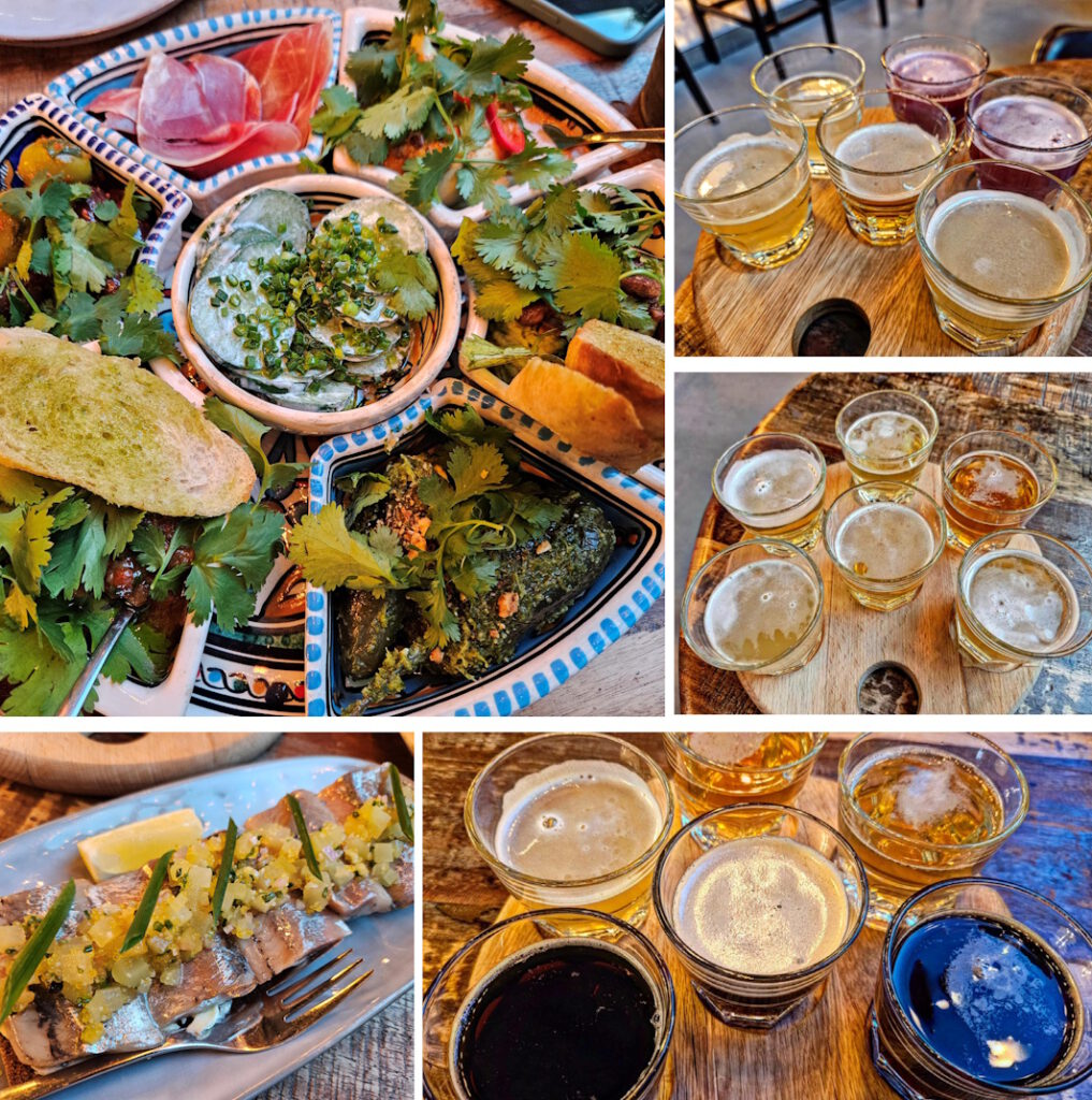 Um die Auswahl auch wirklich genießen zu können, bestellen wir ein paar Kleinigkeiten zum Essen, aber kein Hauptgericht. Und was die Biere anbelangt, da gibt es ein Testbrett mit sechs verschiedenen kleinen Kostproben.