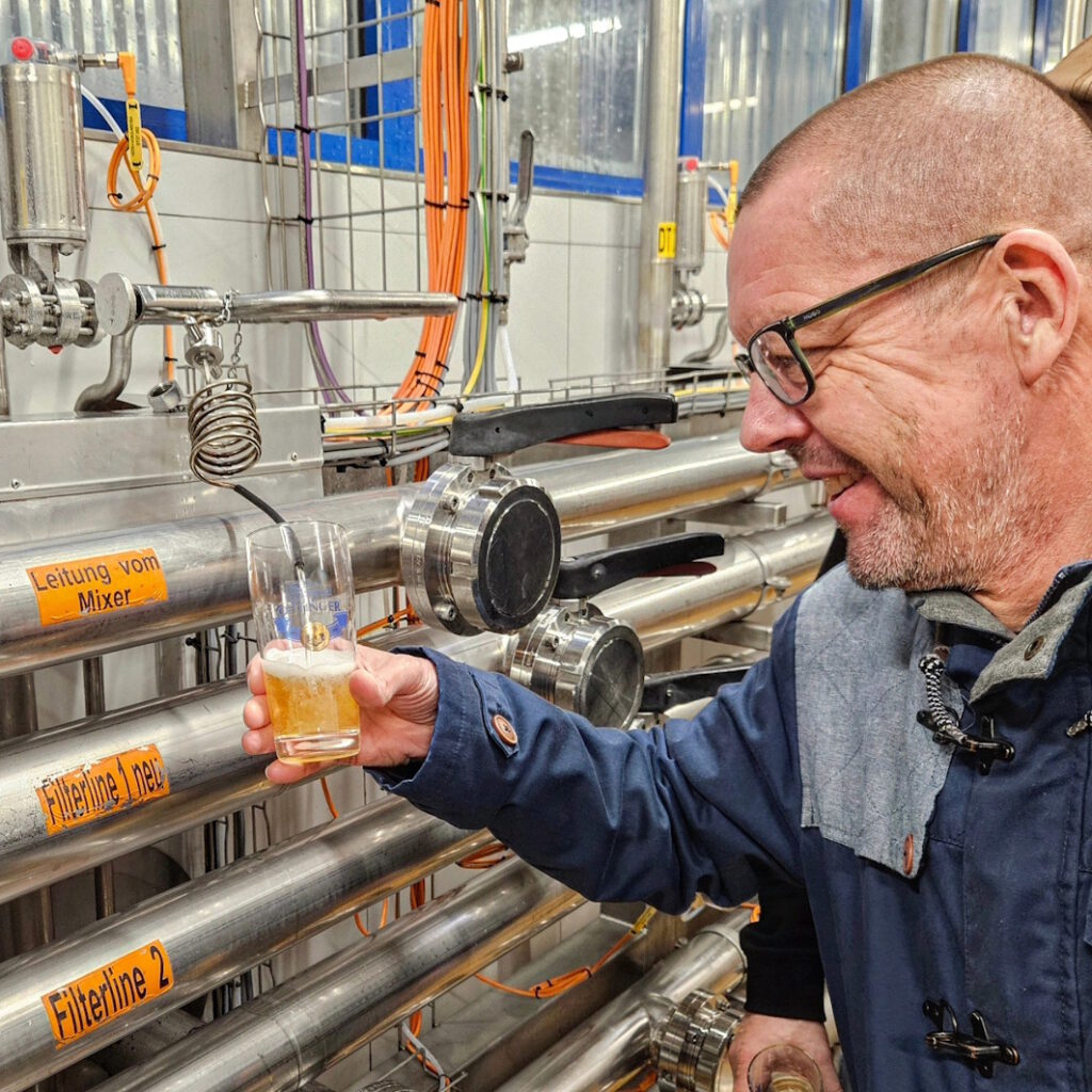 Hochzufrieden dackeln wir ein paar Meter weiter in den nächsten Produktionsabschnitt, und hier bekommen wir noch ein zweites Mal das Export, diesmal aber aus dem Abfülltank, soll heißen, es ist schon filtriert und runterverdünnt. So, wie es dann in die Flaschen und Dosen kommen wird. Aber: Knallfrisch! Auch das schmeckt sehr ansprechend, wenn auch im direkten Vergleich zum Bier vorher jetzt vielleicht etwas dünn wirkend. Da wir allerdings sogar selbst zwickeln dürfen, trotzdem ein Extra-Erlebnis.