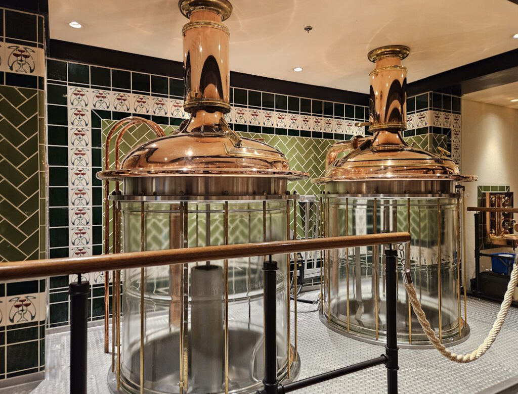 Einmal noch schauen wir an den kupferverkleideten Gär- und Lagertanks entlang, betrachten die Deko dazwischen, und dann nehmen wir Platz und sind gespannt, wie die Bordbiere schmecken.