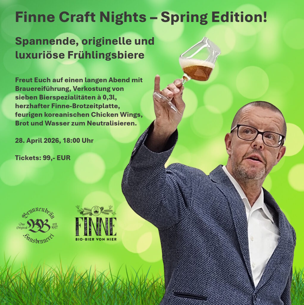 Freut Euch auf einen ganz besonderen Abend in der Finne Hafenbrauerei mit dem Biersommelier Volker R. Quante. Euch erwartet eine Verkostung von spannenden, originellen und luxuriösen Frühlingsbieren, von klassisch bis kreativ, natürlich garniert mit Tipps, schmackhaften Snacks und zahlreichen Überraschungen. Und eine Brauereiführung ist auch noch inklusive.
