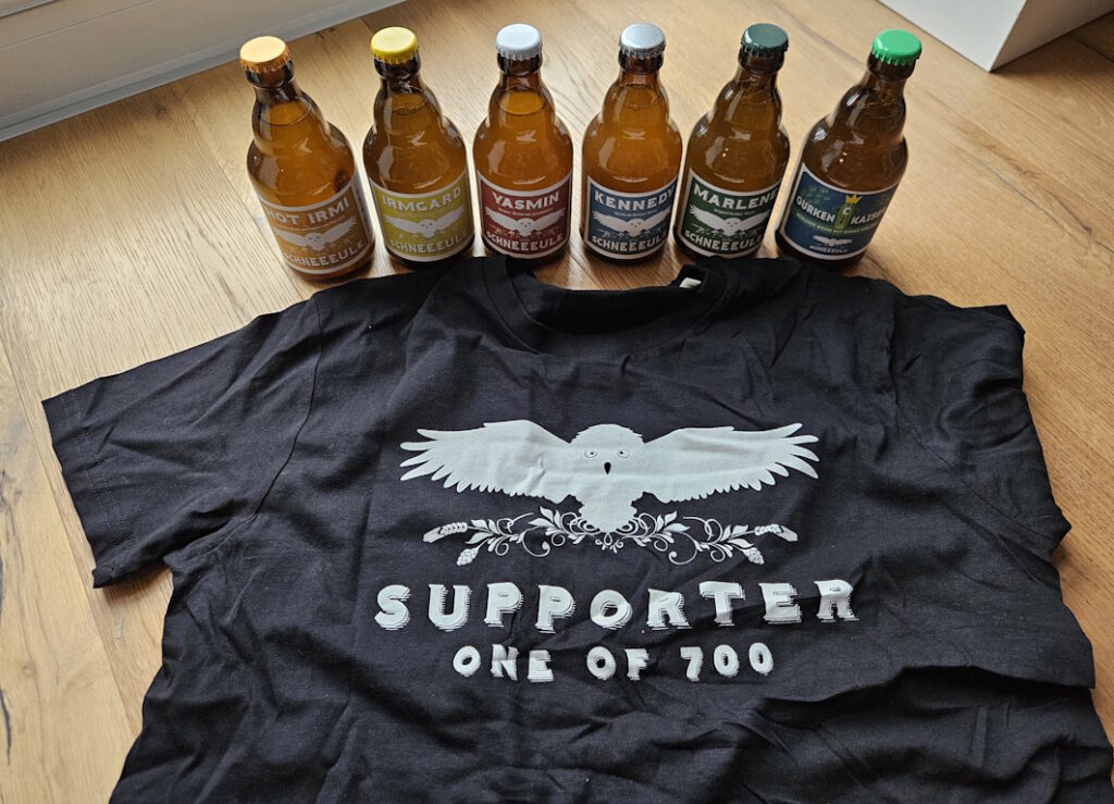 Aber ein paar Minuten später fällt mir alles wieder ein – als ich nämlich das T-Shirt mit dem Aufdruck „Supporter – One of 700“ aus dem Karton ziehe. Ach ja, stimmt ja, im April des letzten Jahres war das, als Ulrike Genz für ihre Brauerei Schneeeule Unterstützung benötigte. Die Schneeeule brauchte ein neues Zuhause!