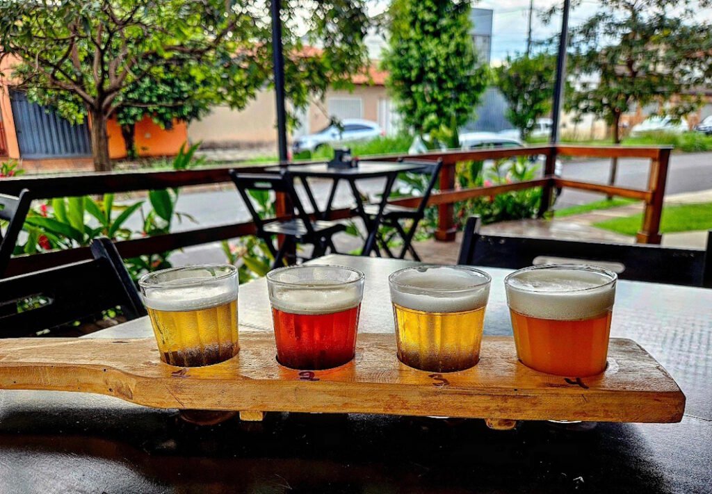 Einmal angekommen ist aber alles in bester Ordnung. Zwar hat die Trema Cervejaria, der Ausschank der gleichnamigen Wanderbrauerei, vor zehn Minuten erst geöffnet und ich bin der erste und noch einzige Gast, dafür komme ich aber auch mit den beiden hinter der Theke schnell ins Gespräch. Rasch haben sie mich davon überzeugt, drei Tasting-Flights zu je vier Gläsern zu bestellen – immerhin gibt es elf verschiedene Biere am Hahn.