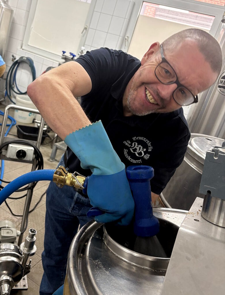 Lennart Tietz, der Eigentümer, Wirt, Visionär und Mädchen für alles beim Küsters, und ich treffen uns also in der Brauerei. Kolja hat schon ein bisschen vorbereitet und eingemaischt, aber es gibt noch genügend Handlangerarbeiten zu tun. Und zu erzählen gibt’s auch viel. Vom großen Heißwassertank, der die Energiekosten der Brauerei jetzt massiv senken wird. Vom zweiten Läuterbottich, der den Prozess beschleunigt und das Läuterverhalten verbessert. Und vom großen Gärtank, der jetzt Doppel- und Dreifachsude erlaubt und der deswegen sogar einen eigenen Namen bekommen hat.