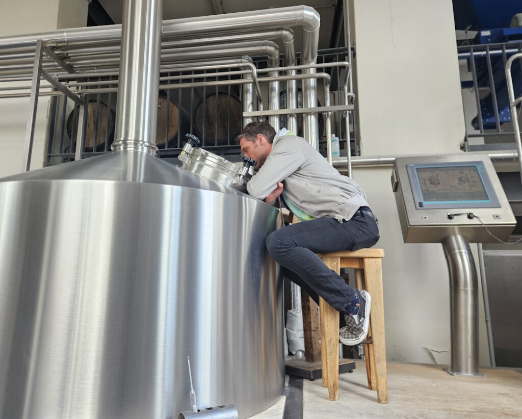 Parallel dazu beginnt aber auch schon das Einmaischen. Durch das große Schauglas sehen wir, wie das Malz in den Maischebottich rieselt, mit Wasser vermischt und sanft durchgerührt wird. Begeistert wie kleine Kinder an einer Modelleisenbahn schauen wir Kolja zu, wie er auf dem Schaltpult die unterschiedlichen Einstellungen vornimmt und das Sudwerk zum Leben erwacht.