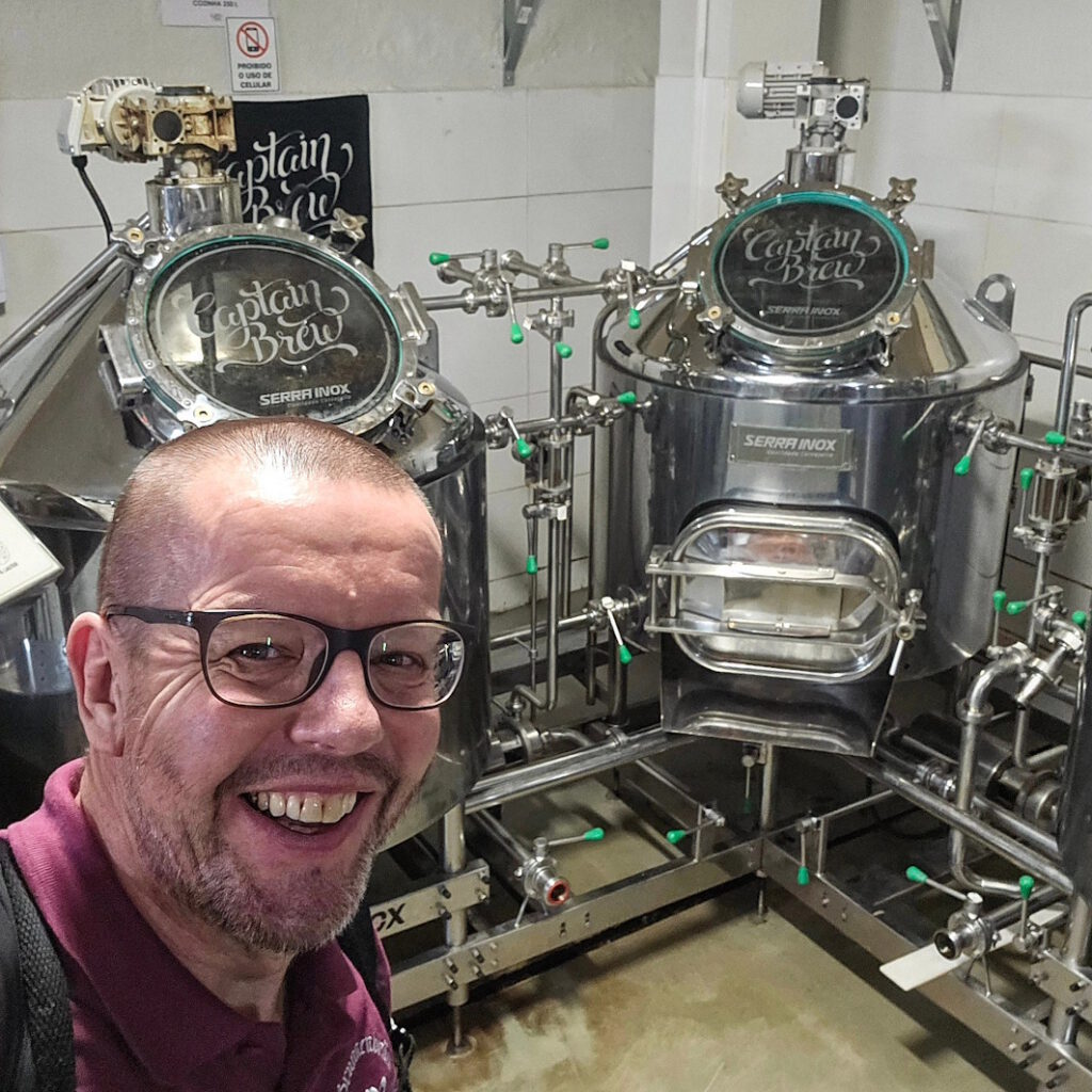 Mittendrin mit zerzausten Haaren, Brille, Bart und ansteckendem Lachen: Flavio Jordok. Chef und Eigentümer der Brauerei Captain Brew. Er heißt unsere Gruppe, die Judges des Concurso Brasileiro de Cervejas Brasil 2026, willkommen, und erst nachdem jeder ausgiebig begrüßt und kräftig umarmt wurde, geleitet er uns nach hinten, wo er ein paar Tische reserviert hat – mit direktem Blick durch die Glastüren auf die Brauerei. Nicht schlecht!