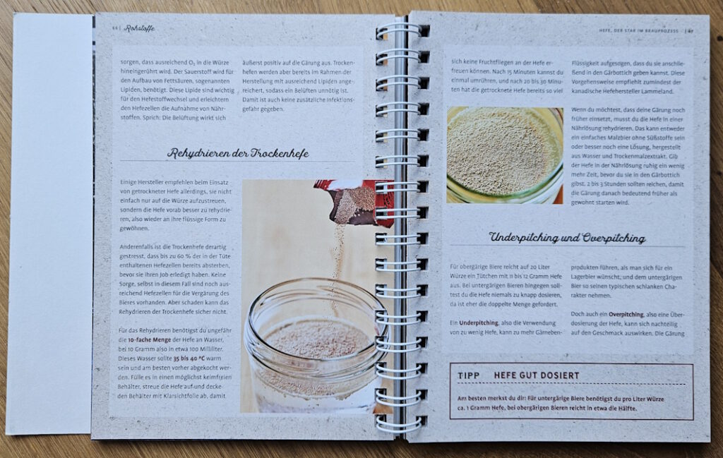Wie schon das erste Buch Craftbier einfach selber brauen ist auch der zweite Band, der sich jetzt an die fortgeschritteneren Hobbybrauer wendet, mit praktischer Spiralbindung und trotzdem geschlossenem Rücken gebunden. Jetzt natürlich nicht mehr so überraschend, aber immer noch sehr praktisch. Auch die grafische Gestaltung des Buchs „Noch mehr Craftbier selber brauen“ lehnt sich sowohl beim Umschlag als auch beim Innenlayout sehr eng an das erste Buch an – ein schöner Wiederkennungswert.