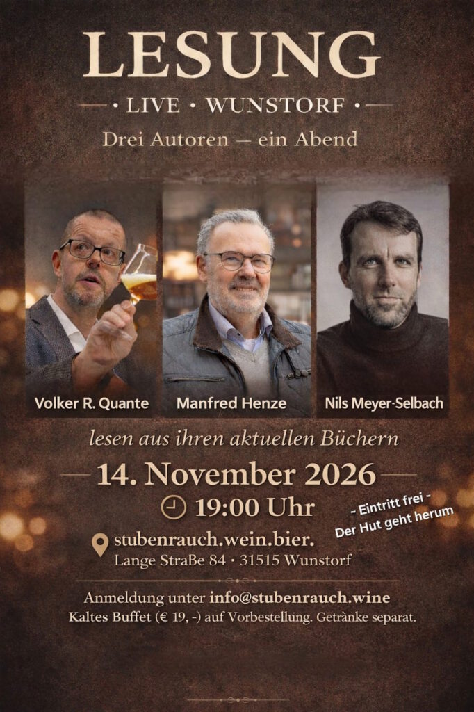 Zu Gast bei stubenrauch.wein.bier sind am 14. November 2026 der Ahrensburger Krimiautor Nils Meyer-Selbach, der 2022 den ersten Ahrensburger Krimiroman „Ahrensmord“ als Anthologie herausgegeben hat, der langjährige Neustädter Polizei-Chef Manfred Henze, dessen Bücher reale Kriminalfälle zum Inhalt haben, die sich im 19. und frühen 20. Jahrhundert rund um das Steinhuder Meer zugetragen haben, sowie der Wunstorfer Bier-Literat Volker R. Quante, der als Bierweltenbummler Bücher, Zeitschriftenartikel, Kurzgeschichten und tausende Blog-Beiträge verfasst hat. Alle drei werden die Gäste mit neuen Texten und kurzweiligen Vorträgen unterhalten.