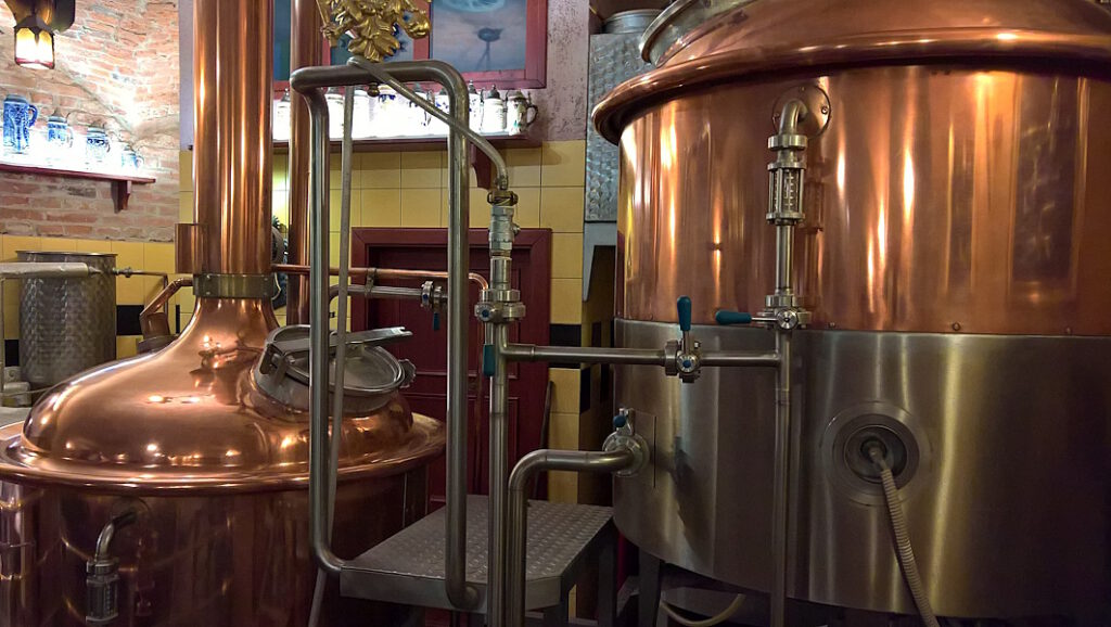 Rechts neben dem Hotel geht es in die Einfahrt. Wir stapfen durch den Schnee; große Holzfässer weisen uns den Weg. Am Ende des Gebäudes geht eine kleine Treppe in den Keller, die Pivnice. Unter dem Ziegelgewölbe kauert sich links eine kleine Theke in den Winkel, vor uns ein halbes Dutzend Biertische, und am Ende des Kellerraums ein kupfernes Sudwerk. Recht groß, fast schon ein wenig überdimensioniert für den niedrigen Kellerraum, aber schön anzusehen.